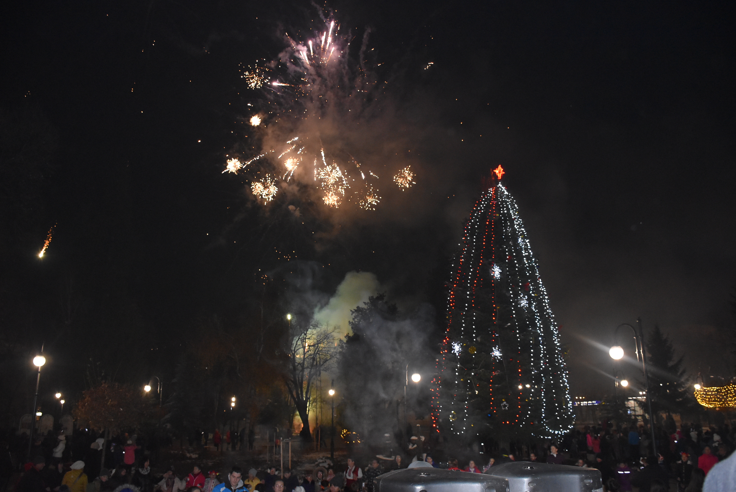 Богатата коледна премяна от разноцветни лампички, звезди и светещи маркучи бе разположена върху царствените клони на естествена 18-метрова елха, която расте в градината. Тържеството започна с едночасова програма точно в 17:30 часа. На финала множеството на препълнения площад извърши традиционното обратно броене и светлините грейнаха за радост на малки и големи.