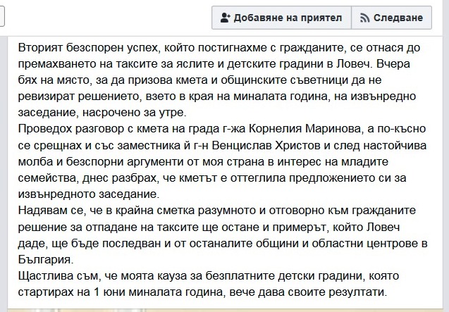 А ето какво побърза да разтръби Мая Манолова във ФБ на страницата си след визитата си Ловеч.