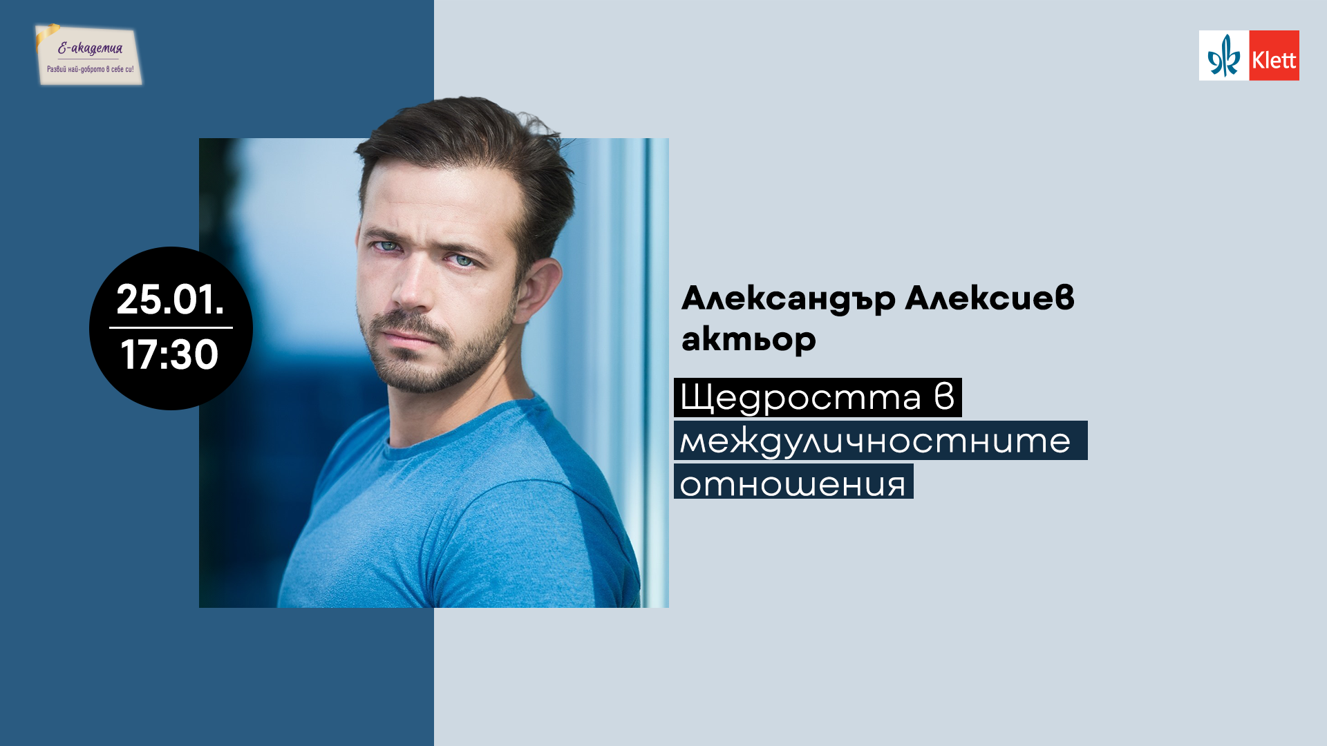 Актьорът, продуцентът и бащата Александър Алексиев е първият специален гост в онлайн инициативата Е-академия, а темата, която ще разгледа е за щедростта в междуличностните отношения. Алексиев ще сподели личната си гледна точка, ще даде примери от своя живот и ще отговори на редица въпроси, зададени от аудиторията. Вдъхновяващата среща ще се проведе на 25 януари (четвъртък) от 17:30 часа. Всеки желаещ да се включи може да го направи като заяви своето безплатно участие тук.