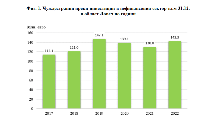 Преките чуждестранни инвестиции (ПЧИ) в нефинансовия сектор в област Ловеч към 31.12.2022 г. възлизат на 142.3 млн. евро, което е с 9.5% повече в сравнение с 2021 година.