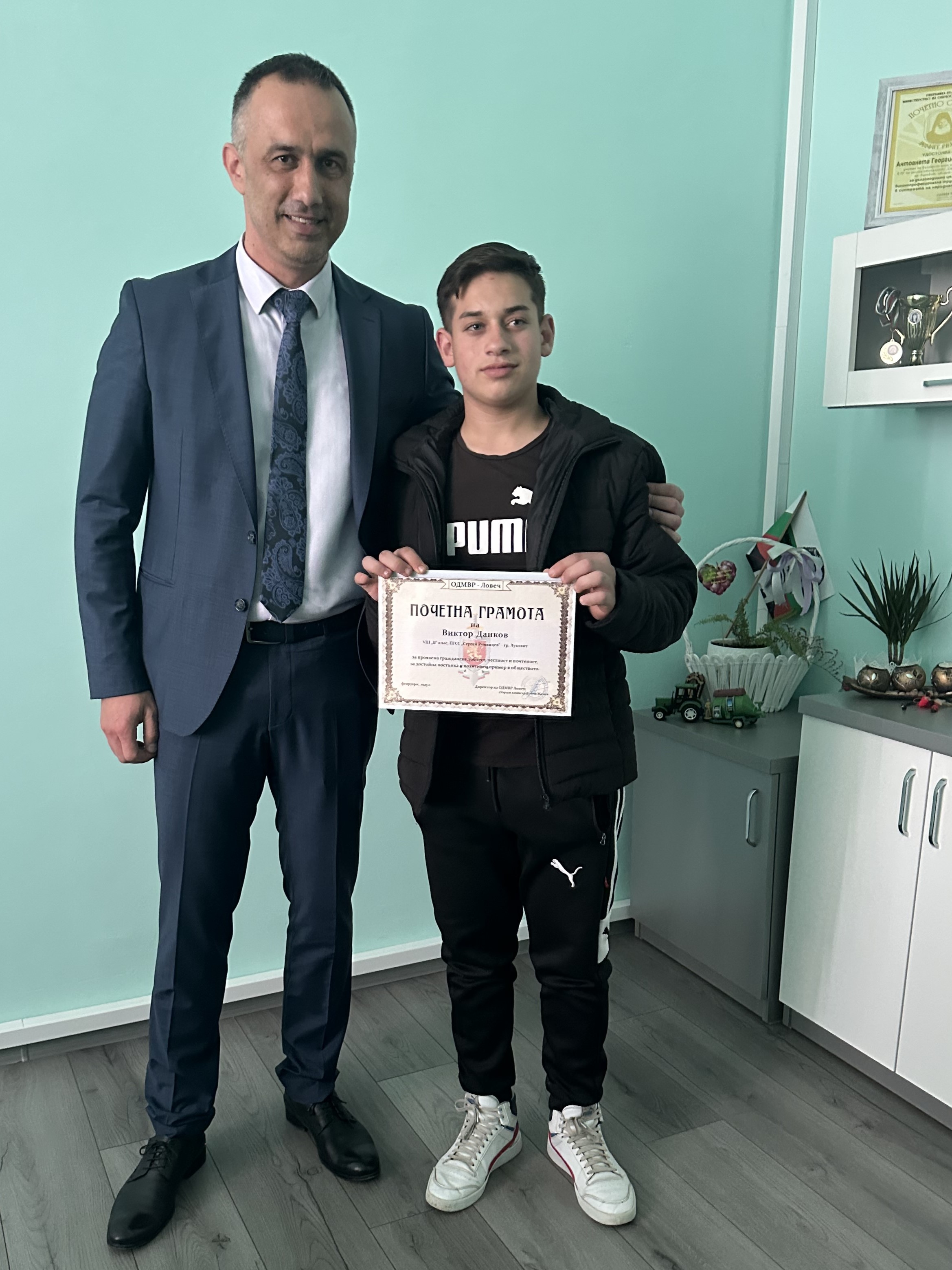 Почетна грамота от ръководството на ОДМВР – Ловеч получи 15-годишният Виктор Данков от Луковит.