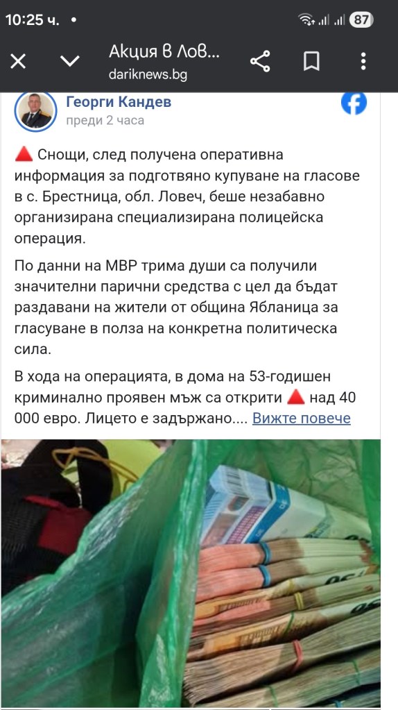 Задържан на 8 април е мъж заради купуване на гласове, съобщи във ФБ главен секретар на МВР Георги Кандев. Това е станало след получена оперативна информация за подготвяно купуване на гласове в с. Брестница, обл. Ловеч. Беше незабавно организирана специализирана полицейска операция.